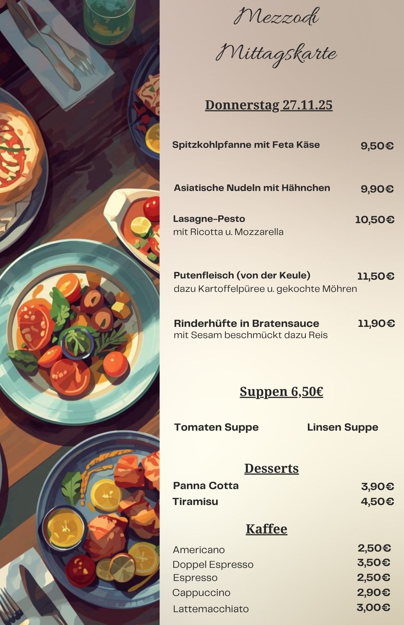 Wer die Kochkunst des Mezzoditeams genießen möchte, sollte sich rechtzeitig auf den Weg machen. Nach original italienischen Rezepten frisch zubereitete Speisen werden bereits ab 11.30 Uhr als Mittagsangebote serviert.